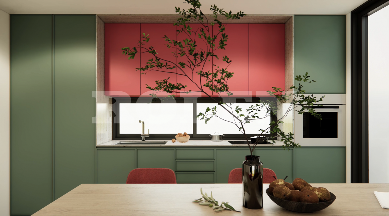 «Цветочный танец» воплощает дух свободы и изысканности стиля бохо. Кухня изготовлена из МДФ с матовой эмалью. В ней эффектно сочетаются оттенки зелёного и красного, создавая эклектичную и живописную палитру, вдохновлённую самой природой.