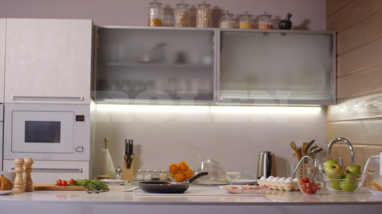 Акцент в «Прозрачной симфонии» сделан на прозрачных и полупрозрачных элементах. Результат — ощущение лёгкости и пространства. Стеклянные фасады, открытые полки и витрины визуально расширяют пространство кухни, впуская свет и воздух.